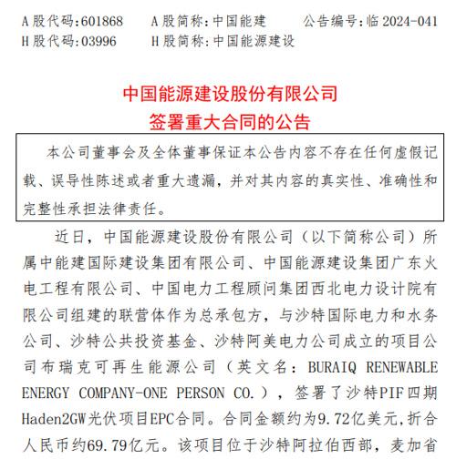 中國能建公告稱,近日,公司所屬中能建國際建設(shè)集團(tuán)有限公司、中國能源建設(shè)集團(tuán)廣東火電工程有限公司、中國電力工程顧問集團(tuán)西北電力設(shè)計(jì)院有限公司組建的聯(lián)營體作為總承包方,與布瑞克可再生能源公司(英文名:BURAIQ RENEWABLE ENERGY COMPANY-ONE PERSON CO.)簽署了沙特2GW光伏項(xiàng)目。