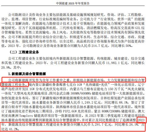 目前,中國能建正在積極搶占新能源市場,大力發(fā)展新能源和綜合智慧能源工程業(yè)務(wù)。2023年,公司新能源及綜合智慧能源工程建設(shè)業(yè)務(wù)新簽合同金額為5291.7億元,同比增長26.1%,占比達(dá)41.2%。