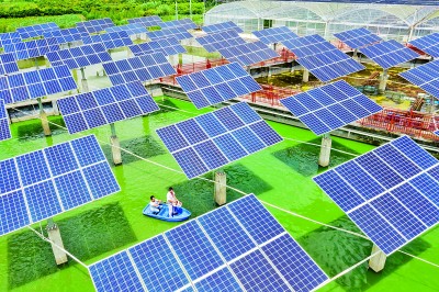 近年來,廣西壯族自治區(qū)蒙山縣因地制宜開展“光伏+漁業(yè)”的光伏發(fā)電項(xiàng)目,將原先一些洼澇地、荒地打造為“漁光互補(bǔ)”光伏電站,改變傳統(tǒng)的漁業(yè)養(yǎng)殖生產(chǎn)方式,實(shí)施農(nóng)光互補(bǔ),既符合國家清潔低碳能源發(fā)展戰(zhàn)略,又為該縣鄉(xiāng)村振興增添新力量。圖為8月17日,工人在“漁光互補(bǔ)”村級光伏電站喂養(yǎng)魚蝦。何華文攝/光明圖片