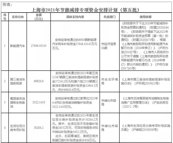 1、按照《財(cái)政部關(guān)于下達(dá)2020年節(jié)能減排補(bǔ)助資金預(yù)算的通知》(財(cái)建[2020]164號(hào))、《財(cái)政部關(guān)于提前下達(dá)2021年節(jié)能減排補(bǔ)助資金預(yù)算(第一批)的通知》(財(cái)建[2020]473號(hào)),根據(jù)《上海市鼓勵(lì)購(gòu)買(mǎi)和使用新能源汽車(chē)暫行辦法(2016年修訂)》(滬府辦發(fā)[2016]7號(hào))、《上海市人民政府辦公廳關(guān)于調(diào)整〈上海市鼓勵(lì)購(gòu)買(mǎi)和使用新能源汽車(chē)暫行辦法(2016年修訂)部分內(nèi)容的通知〉》(滬府辦發(fā)[2017]41號(hào))等規(guī)定,安排經(jīng)審核通過(guò)的6903輛新能源汽車(chē)購(gòu)車(chē)補(bǔ)貼資金27948.43145萬(wàn)元。