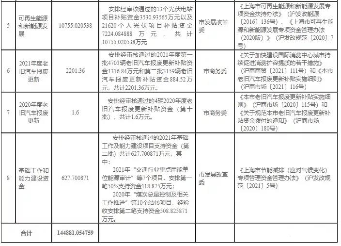 5、按照《上海市可再生能源和新能源發(fā)展專(zhuān)項(xiàng)資金扶持辦法》(滬發(fā)改能源〔2016〕136號(hào))、《上海市可再生能源和新能源發(fā)展專(zhuān)項(xiàng)資金管理辦法(2020版)》(滬發(fā)改規(guī)范〔2020〕7號(hào))等相關(guān)規(guī)定,安排經(jīng)審核通過(guò)的13個(gè)光伏電站項(xiàng)目以及21620個(gè)人光伏項(xiàng)目補(bǔ)貼資金,共計(jì)10755.020538萬(wàn)元。