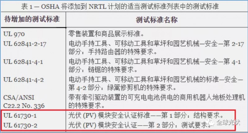 OSHA 于 2021 年 8 月 16 日發(fā)布通知,宣布修改 NRTL 計劃的適當測試標準清單和認可范圍的提案 ( 86 FR 45755 )。其中和光伏產(chǎn)品相關的是光伏組件的安全認證標準。