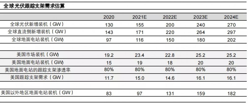 隨著跟蹤支架持續(xù)技術迭代,其經濟性和可靠性等方面的性能持續(xù)提升,相對固定支架的優(yōu)勢有望進一步凸顯,從而推動跟蹤支架滲透率的提升。我們估算,未來3年內,全球跟蹤支架需求有望達到34%,美國以外地區(qū)的跟蹤支架需求的復合增速有望達到45%。