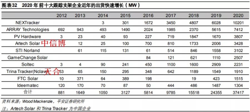 在2012-2020年度全球10大跟蹤企業(yè)出貨量排名中,中信博和天合光能是國內僅有的2家進入全球出貨前10的跟蹤支架企業(yè)。