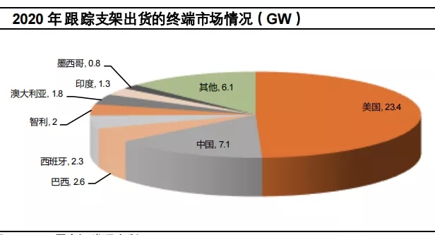 近年,隨著光伏需求的增長以及跟蹤支架性價比的提升,全球跟蹤支架出貨量呈現(xiàn)快速增長。據(jù)彭博新能源統(tǒng)計,2020年度全球跟蹤支架出貨 47.5GW,其中美國市場需求23.4GW,占比約50%。此外,拉丁美洲、西班牙、澳大利亞、印度、中東等光照條件比較好的地區(qū)的跟蹤支架需求也很可觀。