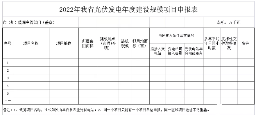 為積極貫徹落實國家“碳達峰、碳中和”工作目標,實現(xiàn)我省能源產(chǎn)業(yè)轉型、高質量發(fā)展,有序推進新能源項目建設,根據(jù)《貴州省風電光伏發(fā)電項目管理暫行辦法》,現(xiàn)開展我省2022年風電光伏發(fā)電年度建設規(guī)模項目申報工作,有關事項通知如下: