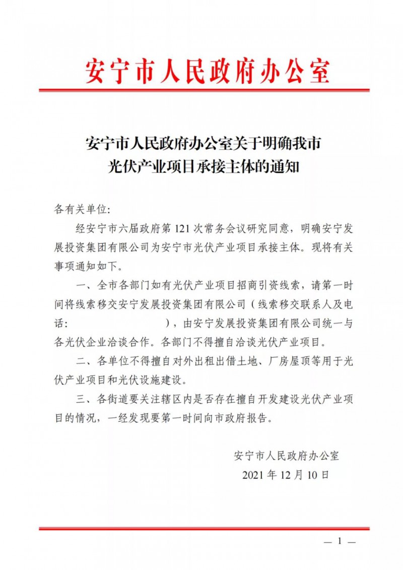 12月10日,安寧市政府下發(fā)《關于明確我市光伏產業(yè)項目承接主體的通知》,通知明確安寧發(fā)展投資集團有限公司為安寧市光伏產業(yè)項目承接主體。