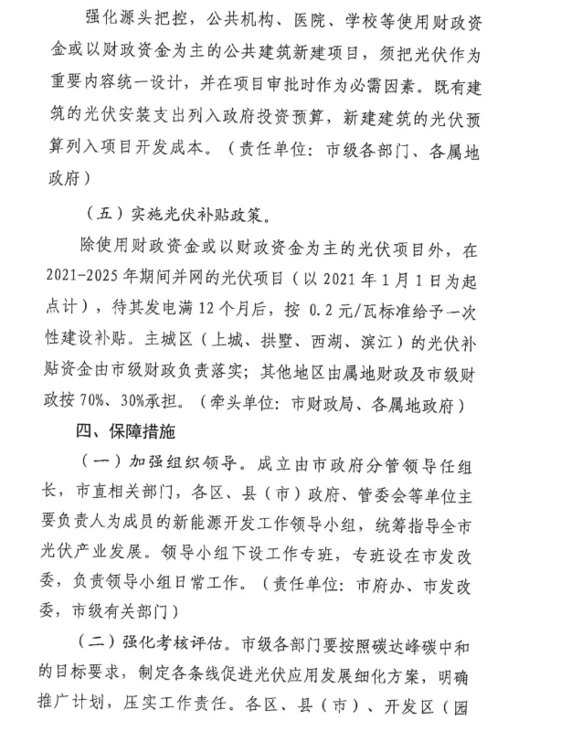 文件提到:除使用財政資金或以財政資金為主的光伏項目外,在2021-2025年期間并網(wǎng)的光伏項目(以2021年1月1日為起點計),待其發(fā)電滿12個月后,按0.2元/瓦標準給予一次性建設補貼。主城區(qū)(上城、拱墅、西湖、濱江)的光伏補貼資金由市級財政負責落實;其他地區(qū)由屬地財政及市級財政按70%、30%承擔。(牽頭單位:市財政局、各屬地政府)