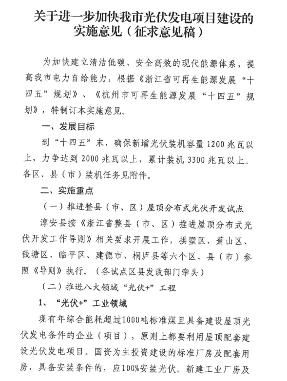 近日,杭州市發(fā)改委發(fā)布了一則關于征求《關于進一步加快我市光伏發(fā)電建設的實施意見(征求意見稿)》意見的函。