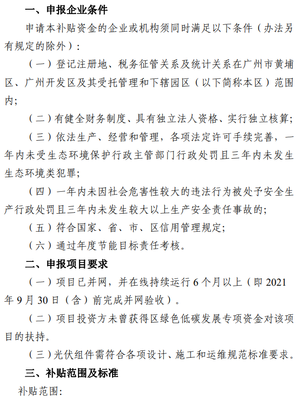 3月14日,廣州黃埔區(qū)、開發(fā)區(qū)發(fā)布了“關(guān)于組織開展2022年度第一批分布式光伏發(fā)電項目投資方發(fā)電量補貼資金申報工作的通知”。通知明確:補貼范圍為2021年5月20日至2022年2月28日期間的發(fā)電量。補貼標準為:應(yīng)用方(屋頂方)為非公共機構(gòu)的按 0.15 元/千瓦時;應(yīng)用方(屋頂方)為公共機構(gòu)的按 0.3 元/千瓦時。