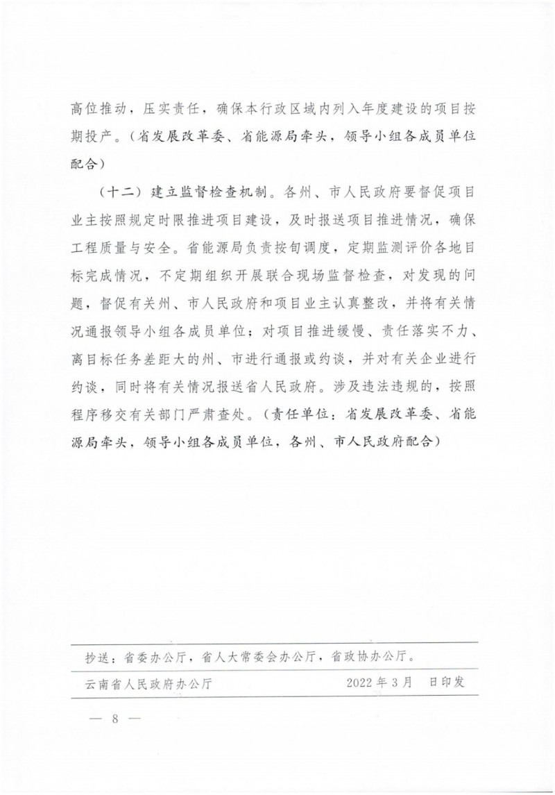優(yōu)先支持大型基地開發(fā),重點支持金沙江下游、瀾滄江中下游、紅河流域、金沙江中游、瀾滄江金沙江上游“風光水儲”和曲靖“風光火儲”等6個多能互補基地,爭取3年內全面開工并基本建成。支持“新能源+鄉(xiāng)村振興”項目,積極開展“千鄉(xiāng)萬村沐光行動,重點支持新能源+特色產業(yè)、生態(tài)修復、綠色食品、鄉(xiāng)村旅游等項目。