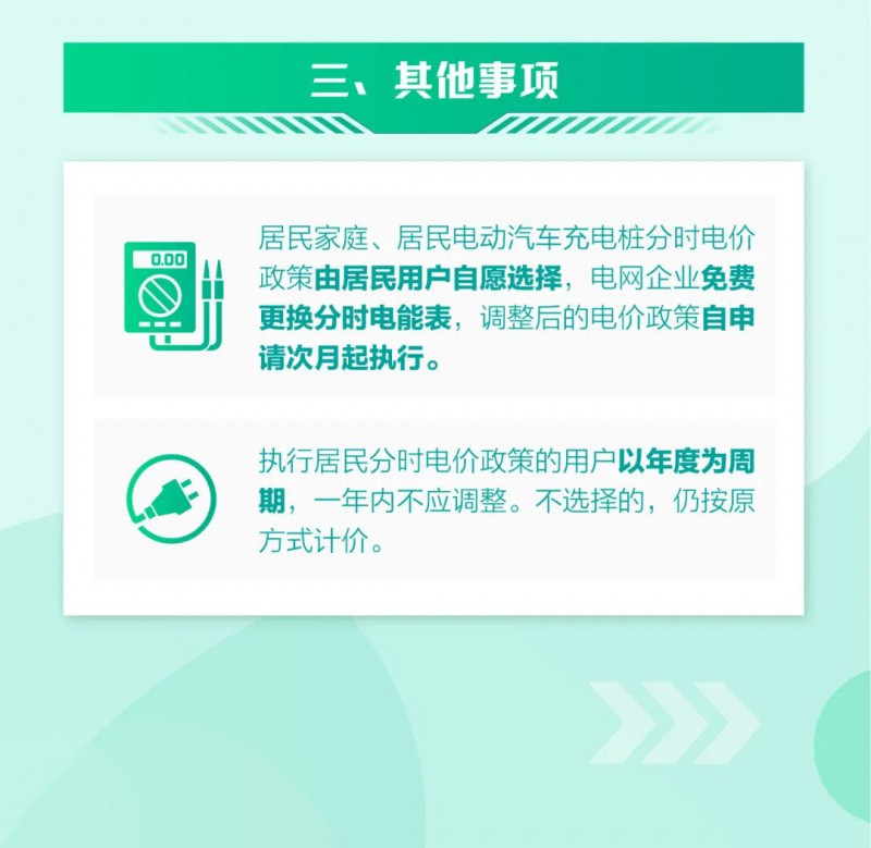 根據(jù)通知,居民家庭、居民電動汽車充電樁分時電價政策由居民用戶自愿選擇,電網(wǎng)企業(yè)免費更換分時電能表,調(diào)整后的電價政策自申請次月起執(zhí)行。執(zhí)行居民分時電價政策的用戶以年度為周期,一年內(nèi)不應調(diào)整。不選擇的,仍按原方式計價。