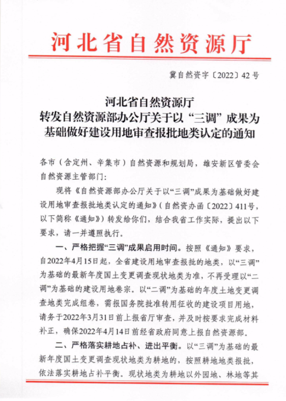 近期,河北省自然資源廳轉(zhuǎn)發(fā)自然資源部辦公廳關(guān)于以“三調(diào)”成果為基礎(chǔ)做好建設(shè)用地審查報批地類認定的通知,按照《通知》要求,自2022年4月15日起,全省建設(shè)用地審查報批的地類,以“三調(diào)”為基礎(chǔ)的最新年度國土變更調(diào)查現(xiàn)狀地類為準,不再受理以“二調(diào)”為基礎(chǔ)的建設(shè)用地卷宗。