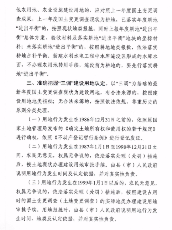 3月9日,自然資源部辦公廳印發(fā)《關(guān)于以"三調(diào)"成果為基礎(chǔ)做好建設(shè)用地審查報批地類認定的通知》,自4月15日起實施?!锻ㄖ访鞔_了建設(shè)用地審查報批時地類認定規(guī)則。對報批時現(xiàn)狀為建設(shè)用地的,應根據(jù)其來源合法性進行分類處理。有合法來源的,按照建設(shè)用地地類報批;無合法來源的,按照建設(shè)占用時的國土變更調(diào)查(土地變更調(diào)查)的實際地類報批,地類為耕地的,應依法落實耕地占補平衡。