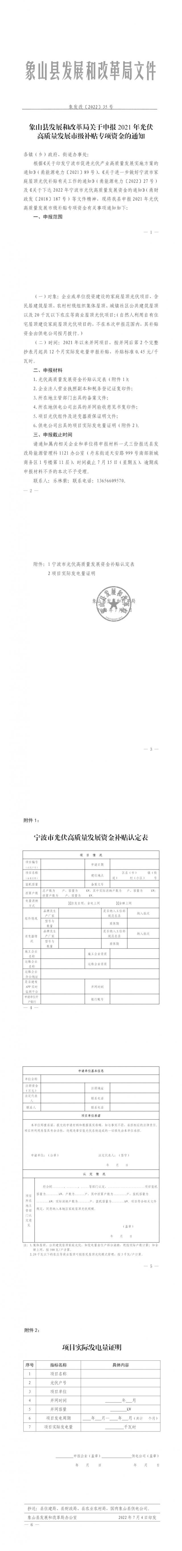 7月5日,浙江象山縣發(fā)展和改革局關于申報2021年光伏高質量發(fā)展市級補貼專項資金的通知發(fā)布。