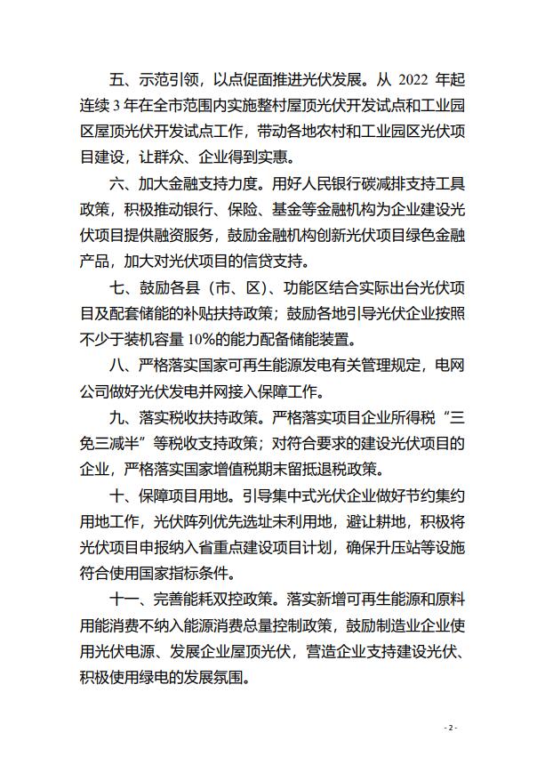 鼓勵(lì)各縣(市、區(qū))、功能區(qū)結(jié)合實(shí)際出臺(tái)光伏項(xiàng)目及配套儲(chǔ)能的補(bǔ)貼扶持政策;鼓勵(lì)各地引導(dǎo)光伏企業(yè)按照不少于裝機(jī)容量10%的能力配備儲(chǔ)能裝置。
