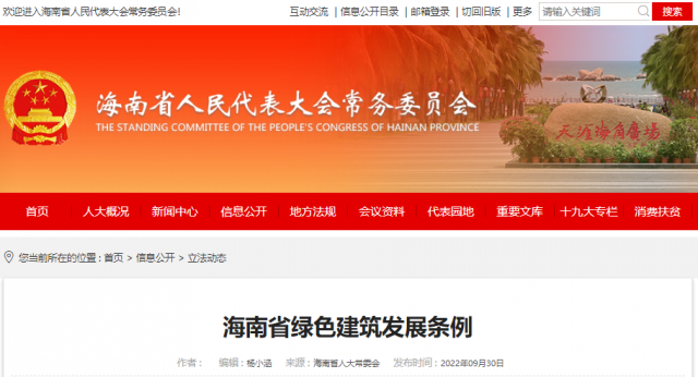 《海南省綠色建筑發(fā)展條例》已由海南省第六屆人民代表大會(huì)常務(wù)委員會(huì)第三十八次會(huì)議于2022年9月29日通過,現(xiàn)予公布,自2023年1月1日起施行。
