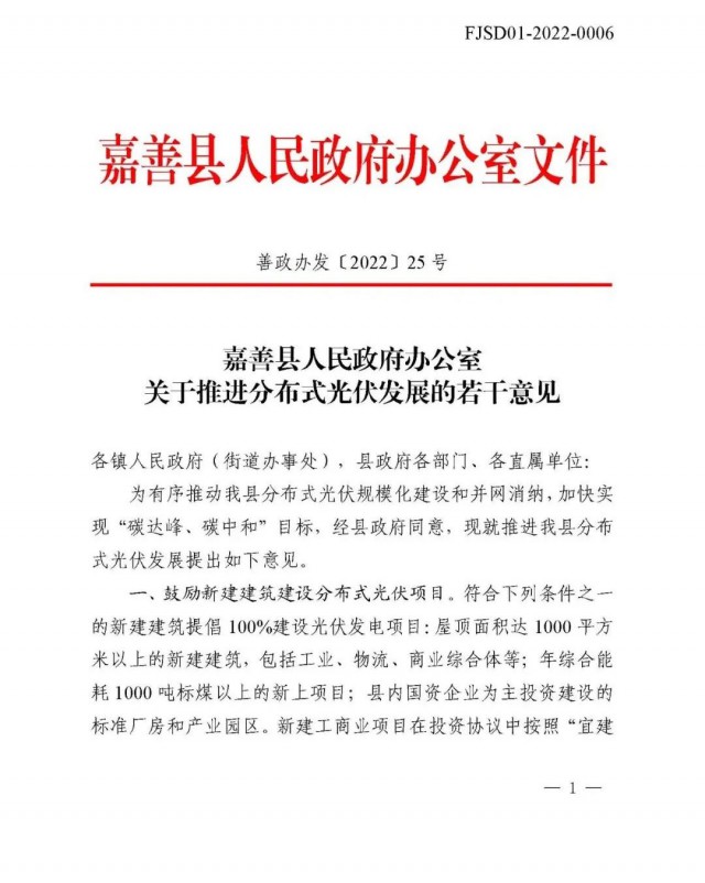 10月14日,嘉善政府網(wǎng)發(fā)布“關(guān)于推進(jìn)分布式光伏發(fā)展的若干意見(jiàn)”。