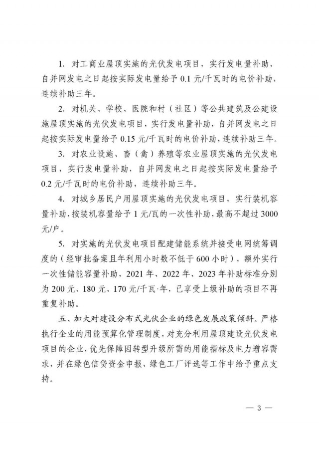4.對(duì)城鄉(xiāng)居民戶用屋頂實(shí)施的光伏發(fā)電項(xiàng)目,實(shí)行裝機(jī)容量補(bǔ)助,按裝機(jī)容量給予1元/瓦的一次性補(bǔ)助,最高不超過(guò)3000元/戶。