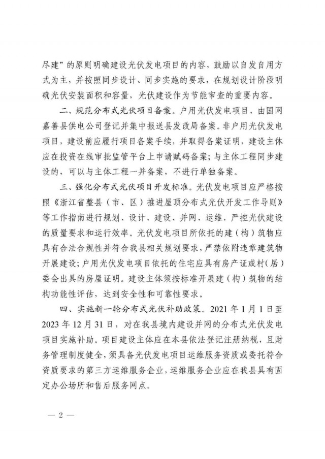 實(shí)施新一輪分布式光伏補(bǔ)助政策。2021年1月1日至2023年12月31日,對(duì)在我縣境內(nèi)建設(shè)并網(wǎng)的分布式光伏發(fā)電項(xiàng)目實(shí)施補(bǔ)助。項(xiàng)目建設(shè)主體應(yīng)在本縣依法登記注冊(cè)納稅,且財(cái)務(wù)管理制度健全,須具備光伏發(fā)電項(xiàng)目運(yùn)維服務(wù)資質(zhì)或委托符合資質(zhì)要求的第三方運(yùn)維服務(wù)企業(yè),運(yùn)維服務(wù)企業(yè)應(yīng)在我縣具有固定辦公場(chǎng)所和售后服務(wù)網(wǎng)點(diǎn)。