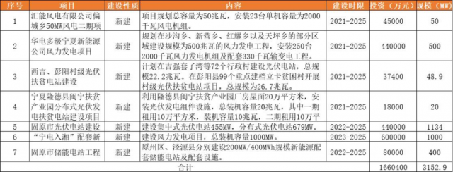 近期,固原市人民政府辦公室印發(fā)固原市自然資源保護(hù)和利用“十四五”規(guī)劃的通知。根據(jù)光伏們查詢,在固原市自然資源保護(hù)和利用“十四五”規(guī)劃建設(shè)項(xiàng)目庫(kù)中,有關(guān)清潔能源產(chǎn)業(yè)的項(xiàng)目共10個(gè)。其中包括光伏、風(fēng)電、儲(chǔ)能的項(xiàng)目共7個(gè),合計(jì)新能源新建規(guī)模3152.9MW,總投資金額166億元。具體項(xiàng)目名單如下: