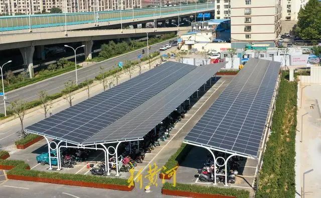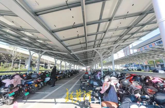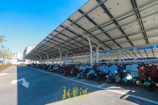 山東大學國家大學科技園停車場的車棚采用光伏一體化結(jié)構(gòu),光伏面板架設(shè)于停車位上方的鋼桁架上,以光伏電池板代替車棚頂面,既能避免車輛日曬雨淋,所發(fā)出的電力又能為園區(qū)、車棚提供照明,起到一舉多得的效果。車棚內(nèi)安裝了充電樁、儲能等配套設(shè)施,可以為電動汽車、電動自行車充電,實現(xiàn)了光儲充一體化,綠色低碳場景再添新貌,進一步邁向智慧零碳園區(qū)。