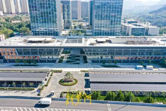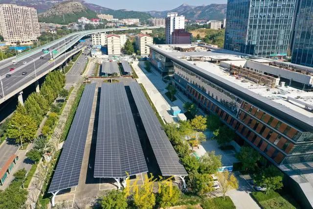 10月19日,濟南市中區(qū)山東大學國家大學科技園的露天停車場新加裝了光伏車棚,光伏停車場在高空俯瞰之下格外壯觀。