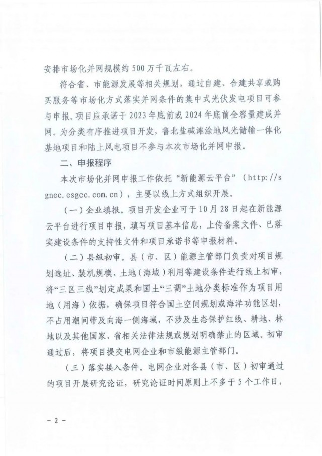符合省、市能源發(fā)展等相關(guān)規(guī)劃,通過(guò)自建、合建共享或購(gòu)買服務(wù)等市場(chǎng)化方式落實(shí)并網(wǎng)條件的集中式光伏發(fā)電項(xiàng)目可參與申報(bào)。項(xiàng)目應(yīng)承諾于2023年底前或2024年底前全容量建成并網(wǎng)。為分類有序推進(jìn)項(xiàng)目開(kāi)發(fā),魯北鹽堿灘涂地風(fēng)光儲(chǔ)輸一體化基地項(xiàng)目和陸上風(fēng)電項(xiàng)目不參與本次市場(chǎng)化并網(wǎng)申報(bào)。