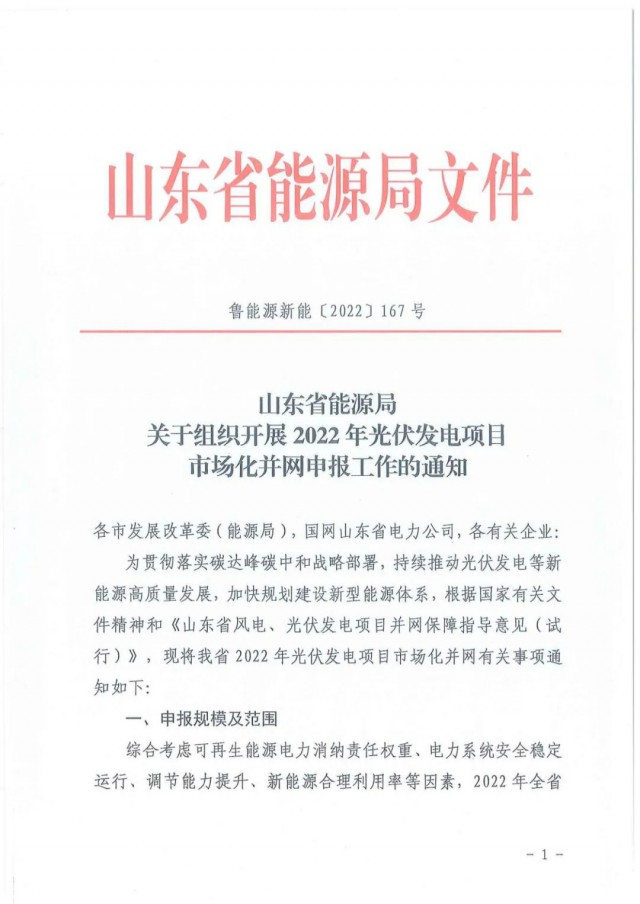 為貫徹落實(shí)碳達(dá)峰碳中和戰(zhàn)略部署,持續(xù)推動(dòng)光伏發(fā)電等新能源高質(zhì)量發(fā)展,加快規(guī)劃建設(shè)新型能源體系,根據(jù)國(guó)家有關(guān)文件精神和《山東省風(fēng)電、光伏發(fā)電項(xiàng)目并網(wǎng)保障指導(dǎo)意見(jiàn)(試行)》,現(xiàn)將我省2022年光伏發(fā)電項(xiàng)目市場(chǎng)化并網(wǎng)有關(guān)事項(xiàng)通知如下: