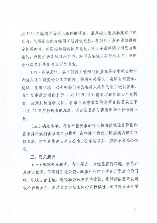 (四)市級(jí)復(fù)審。各市能源主管部門負(fù)責(zé)統(tǒng)籌安排項(xiàng)目初審和接入條件研究論證工作時(shí)限,按照有關(guān)要求,會(huì)同自然資源、海洋、生態(tài)環(huán)境、水利等部門對(duì)具備接入條件的項(xiàng)目進(jìn)行復(fù)審。各市復(fù)審?fù)ㄟ^(guò)項(xiàng)目須于11月19日18時(shí)前通過(guò)新能源云平臺(tái)提交,逾期系統(tǒng)自動(dòng)關(guān)閉。各市正式申報(bào)文件及項(xiàng)目信息表應(yīng)于11月22日前報(bào)送省能源局,項(xiàng)目信息須與新能源云平臺(tái)保持一致。