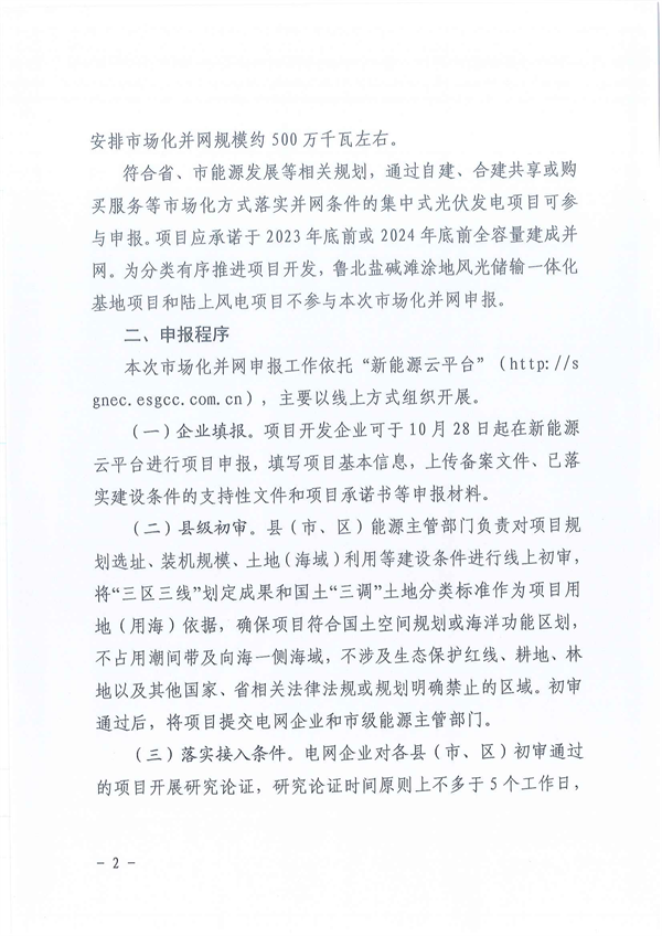 符合省、市能源發(fā)展等相關(guān)規(guī)劃,通過自建、合建共享或購買服務(wù)等市場化方式落實(shí)并網(wǎng)條件的集中式光伏發(fā)電項(xiàng)目可參與申報(bào)。項(xiàng)目應(yīng)承諾于2023年底前或2024年底前全容量建成并網(wǎng)。為分類有序推進(jìn)項(xiàng)目開發(fā),魯北鹽堿灘涂地風(fēng)光儲輸一體化基地項(xiàng)目和陸上風(fēng)電項(xiàng)目不參與本次市場化并網(wǎng)申報(bào)。