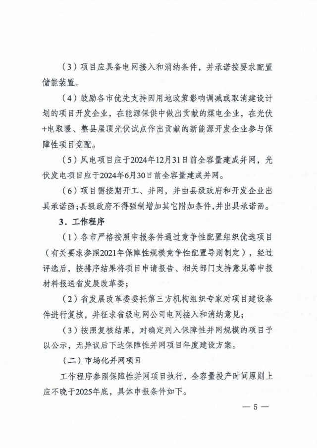 5)保障性規(guī)模項目:風電項目應于2024年12月31日前全容量建成并網(wǎng),光伏發(fā)電項目應于2024年6月30日前全容量建成并網(wǎng)。