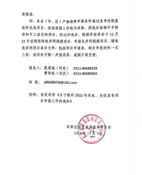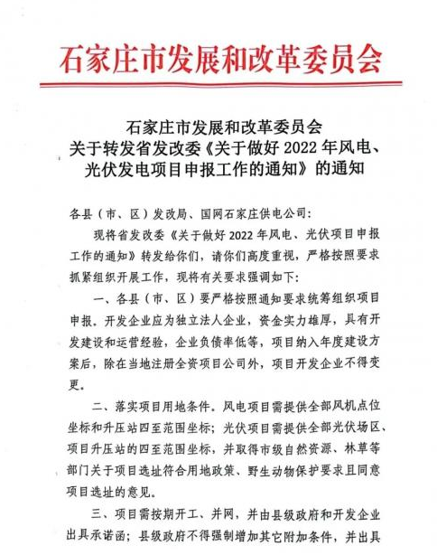 11月7日,河北省石家莊市發(fā)改委印發(fā)《關于做好2022年風電、光伏發(fā)電項目申報工作的通知》,要求項目需按期開工、并網(wǎng),并由縣級政府和開發(fā)企業(yè)出具承諾函;縣級政府不得強制增加其它附加條件,并出具承諾函。