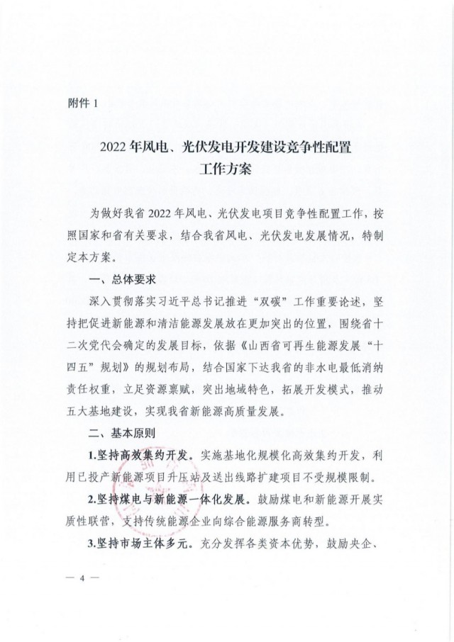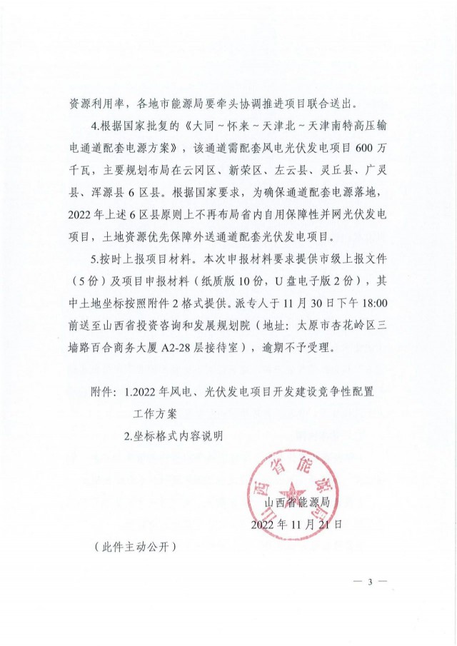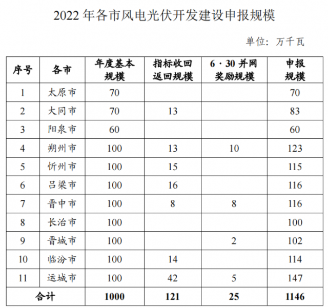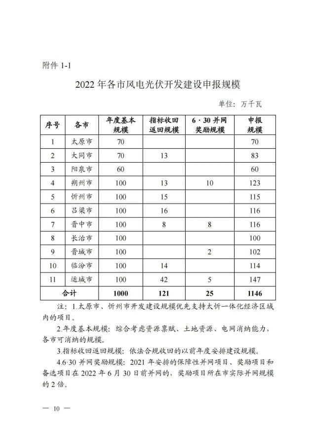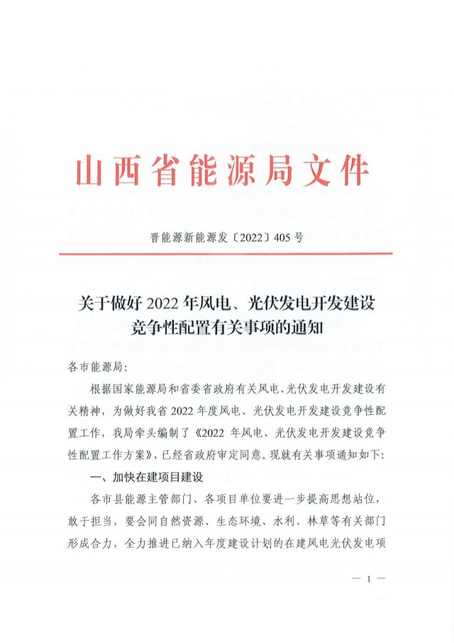 近日,索比光伏網(wǎng)獲悉,山西省能源局印發(fā)《關(guān)于做好2022年風(fēng)電、光伏發(fā)電開發(fā)建設(shè)競(jìng)爭(zhēng)性配置有關(guān)事項(xiàng)的通知》(晉能源新能源發(fā)〔2022〕405號(hào)),明確安排風(fēng)電、光伏保障性并網(wǎng)年度規(guī)模1000萬千瓦,獎(jiǎng)勵(lì)規(guī)模146萬千瓦。