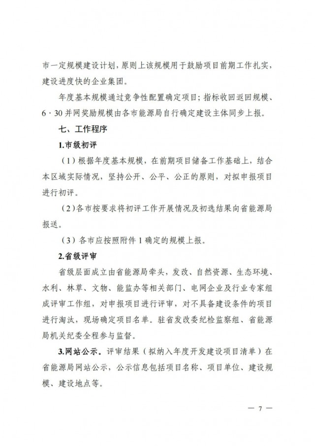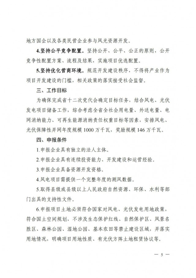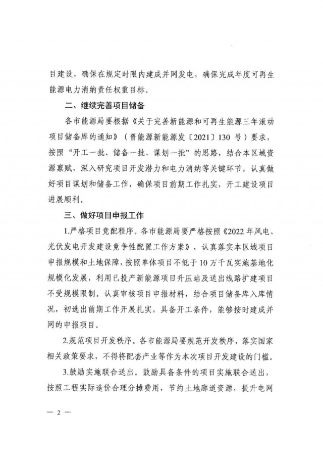 《通知》要求,各市能源局要嚴(yán)格按照《2022年風(fēng)電、光伏發(fā)電開發(fā)建設(shè)競(jìng)爭(zhēng)性配置工作方案》,認(rèn)真落實(shí)本區(qū)域項(xiàng)目申報(bào)規(guī)模和土地保障,按照單體項(xiàng)目不低于10萬千瓦實(shí)施基地化規(guī)?;l(fā)展,利用已投產(chǎn)新能源項(xiàng)目升壓站及送出線路擴(kuò)建項(xiàng)目不受規(guī)模限制。同時(shí),規(guī)范項(xiàng)目開發(fā)秩序,落實(shí)國(guó)家相關(guān)政策要求,不得將配套產(chǎn)業(yè)等作為本次項(xiàng)目開發(fā)建設(shè)的門檻。此外,鼓勵(lì)具備條件的項(xiàng)目實(shí)施聯(lián)合送出,按照工程實(shí)際造價(jià)合理分?jǐn)傎M(fèi)用,節(jié)約土地廊道資源,提升電網(wǎng)資源利用率。