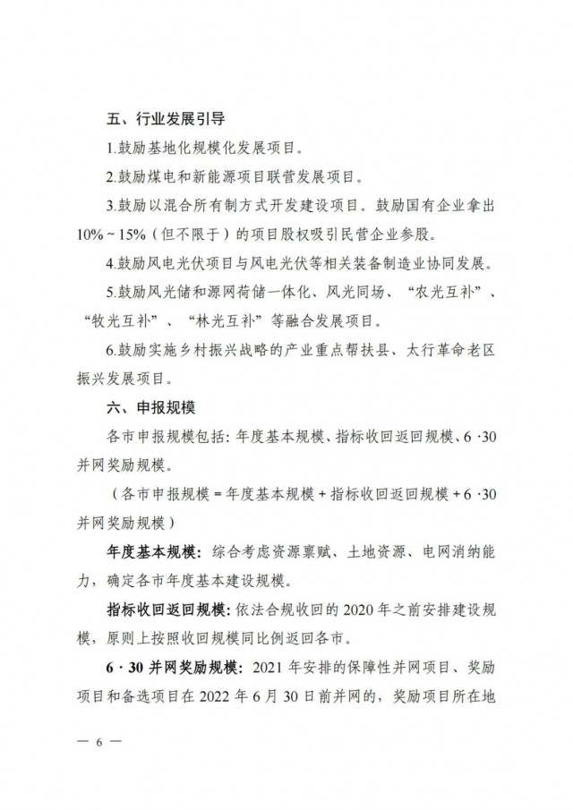 同時(shí),《方案》提出:鼓勵(lì)基地化規(guī)?;l(fā)展項(xiàng)目,鼓勵(lì)煤電和新能源項(xiàng)目聯(lián)營(yíng)發(fā)展項(xiàng)目,鼓勵(lì)以混合所有制方式開發(fā)建設(shè)項(xiàng)目,鼓勵(lì)國(guó)有企業(yè)拿出10%~ 15%(但不限于)的項(xiàng)目股權(quán)吸引民營(yíng)企業(yè)參股,鼓勵(lì)風(fēng)電光伏項(xiàng)目與風(fēng)電光伏等相關(guān)裝備制造業(yè)協(xié)同發(fā)展,鼓勵(lì)風(fēng)光儲(chǔ)和源網(wǎng)荷儲(chǔ)一體化、風(fēng)光同場(chǎng)、“農(nóng)光互補(bǔ)”、“牧光互補(bǔ)”、“林光互補(bǔ)”等融合發(fā)展項(xiàng)目,鼓勵(lì)實(shí)施鄉(xiāng)村振興戰(zhàn)略的產(chǎn)業(yè)重點(diǎn)幫扶縣、太行革命老區(qū)振興發(fā)展項(xiàng)目。