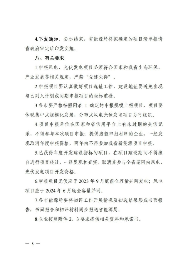 此外,《方案》明確:已獲得年度開發(fā)建設(shè)指標(biāo)的項(xiàng)目,在項(xiàng)目建設(shè)期間不得擅自進(jìn)行項(xiàng)目轉(zhuǎn)讓,一經(jīng)發(fā)現(xiàn)和查實(shí),取消其參與全省范圍內(nèi)風(fēng)電、光伏發(fā)電項(xiàng)目開發(fā)資格。申報(bào)項(xiàng)目光伏應(yīng)于2023年9月底前全容量并網(wǎng)發(fā)電;風(fēng)電項(xiàng)目應(yīng)于2024年6月底全容量并網(wǎng)。