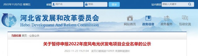 11月23日,河北省發(fā)布《關(guān)于暫停申報(bào)2022年度風(fēng)電光伏發(fā)電項(xiàng)目企業(yè)名單》的公示。通知顯示,為進(jìn)一步加強(qiáng)風(fēng)電光伏發(fā)電項(xiàng)目管理,按照對存有逾期未全容量并網(wǎng)項(xiàng)目企業(yè),原則上在全省范圍內(nèi)暫停該項(xiàng)目相關(guān)企業(yè)當(dāng)年新增項(xiàng)目申報(bào)的政策要求,現(xiàn)將暫停申報(bào)2022年度保障類、市場化企業(yè)名單予以公示。