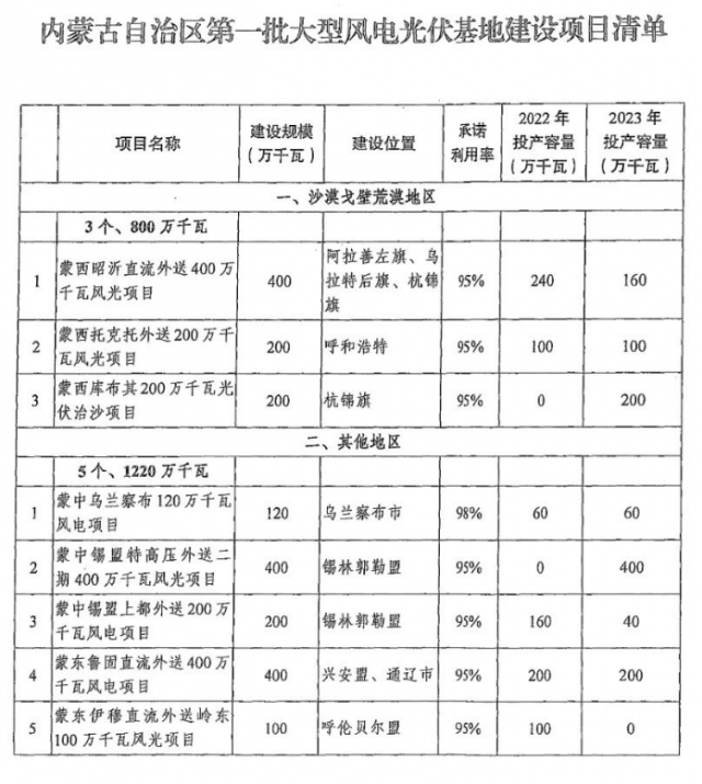 根據(jù)此前公開信息顯示,第一批風(fēng)光大基地總規(guī)模約97.05GW(《總規(guī)模97.05GW!第一批大型風(fēng)、光大基地項(xiàng)目名單發(fā)布》),主要布局在內(nèi)蒙、青海、甘肅等19個省份,包括2GW魯北鹽堿灘基地、2.6GW廣西橫州基地、青海海南、海西10.9GW基地、陜五一期6GW外送基地、渭南3.53GW基地、內(nèi)蒙古2GW光伏治沙……等等均已悉數(shù)開工。其中,內(nèi)蒙古第一批8個國家大型風(fēng)電光伏基地項(xiàng)目共計(jì)2020萬千瓦。
