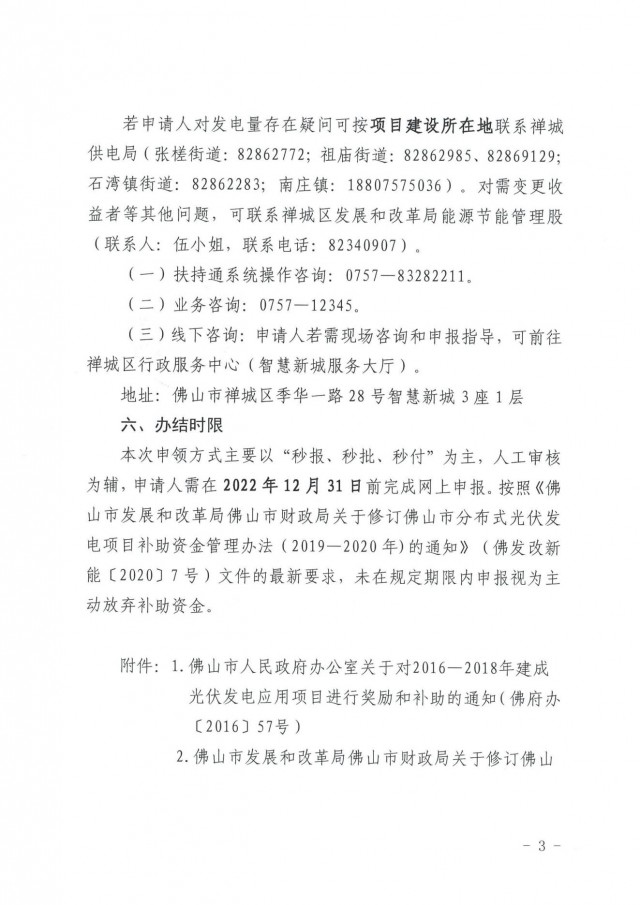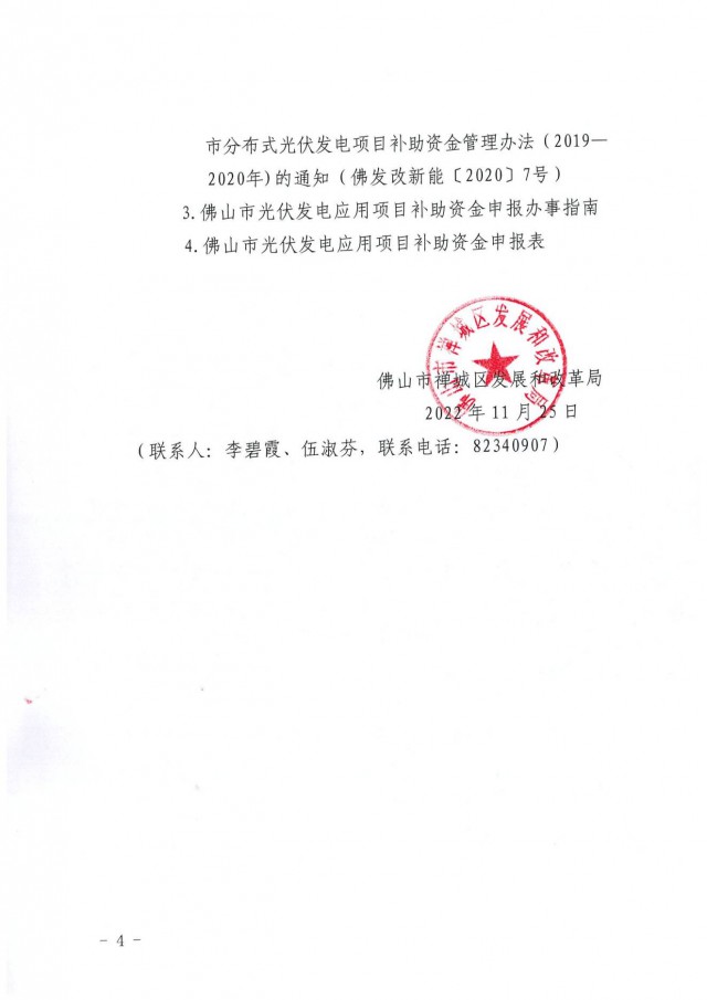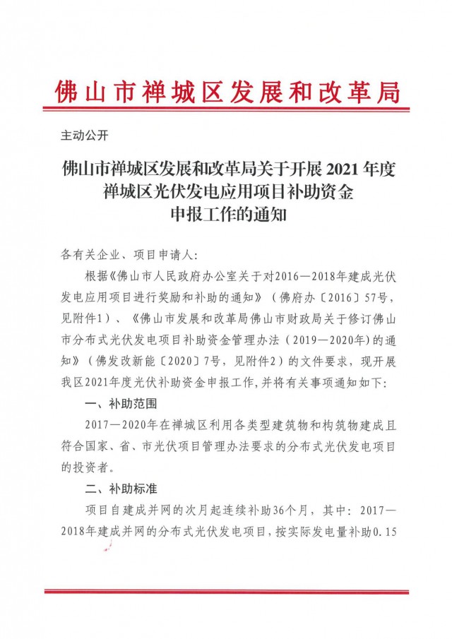 近日,佛山市禪城區(qū)發(fā)展和改革局印發(fā)《關于開展2021年度禪城區(qū)光伏發(fā)電應用項日補助資金申報工作的通知》。