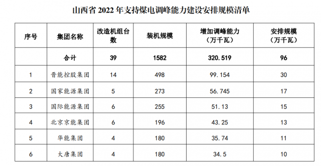 在煤電調(diào)峰安排清單中,主要企業(yè)為晉能、國(guó)家能源集團(tuán)、山西國(guó)際、京能、華能、大唐等6家央國(guó)企,增加調(diào)峰能力3.2GW,安排新能源規(guī)模0.96GW。