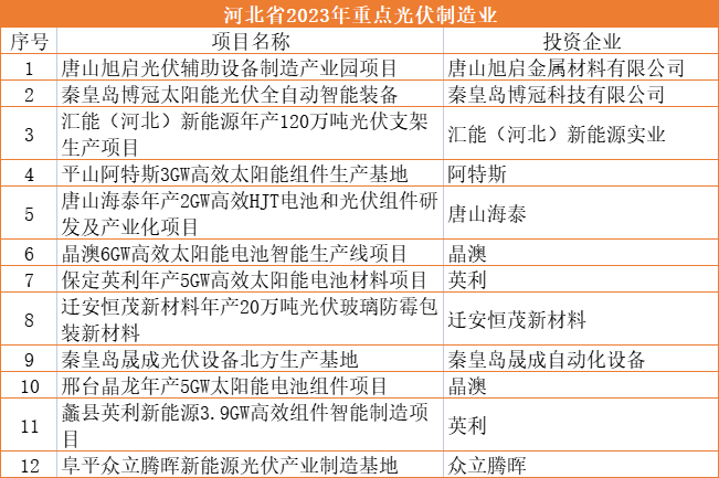 1月18日,河北省發(fā)改委發(fā)布了2023年省級(jí)重點(diǎn)建設(shè)項(xiàng)目名單,項(xiàng)目共計(jì)507項(xiàng),總投資1.32萬(wàn)億元,年度預(yù)計(jì)投資2600.1億元。其中涉及光伏項(xiàng)目為22項(xiàng),10個(gè)為光伏電站項(xiàng)目,12個(gè)為光伏制造業(yè)。