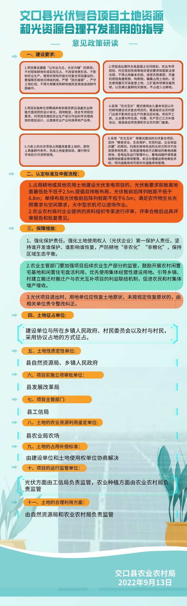 為深入貫徹習(xí)近平生態(tài)文明思想,全方位推動高質(zhì)量發(fā)展,構(gòu)建綠色、低碳、循環(huán)發(fā)展體系,推進能源革命引領(lǐng)經(jīng)濟轉(zhuǎn)型,助力我縣市場主體倍增,根據(jù)(晉自然資函[2022]323號)文件精神,現(xiàn)就支持光伏產(chǎn)業(yè)發(fā)展,促進土地資源和光資源合理開發(fā)利用,防止耕地“非糧化”,“非農(nóng)化”和棄耕撂荒,提出如下指導(dǎo)意見:?