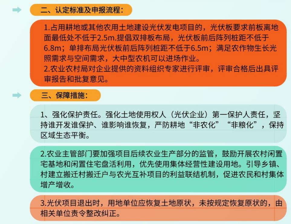 4、采用“農(nóng)光互補”模式使用永久基本農(nóng)田以外的耕地建設光伏復合項目的,需縣級農(nóng)業(yè)農(nóng)村部門出具不影響農(nóng)業(yè)生產(chǎn)的意見后實施。項目開工前,企業(yè)需與所在縣、村委、農(nóng)戶簽訂三方補償協(xié)議,報縣級自然資源和農(nóng)業(yè)農(nóng)村部門備案。