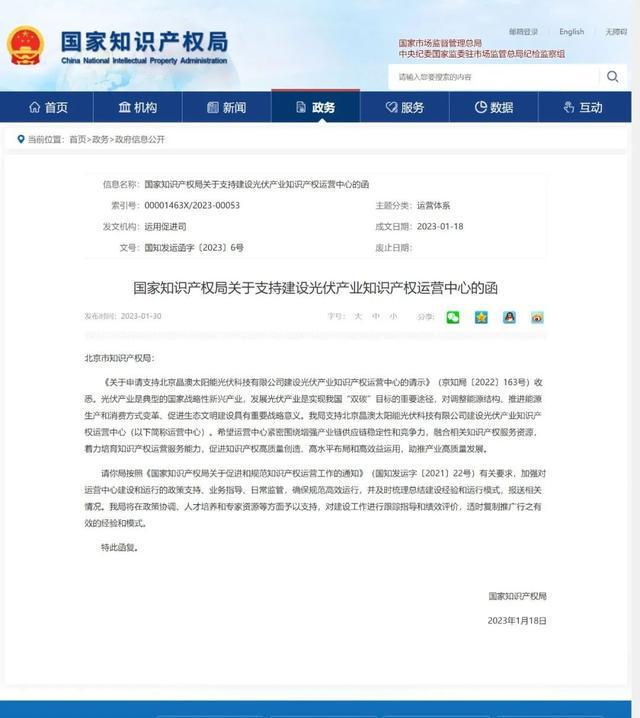 1月30日,國家知識產(chǎn)權(quán)局發(fā)布《關(guān)于支持建設(shè)光伏產(chǎn)業(yè)知識產(chǎn)權(quán)運營中心的函》,明確支持北京晶澳太陽能光伏科技有限公司(以下簡稱“晶澳科技”)建設(shè)“光伏產(chǎn)業(yè)知識產(chǎn)權(quán)運營中心”。這是光伏制造領(lǐng)域(不含多晶硅)首個國家級知識產(chǎn)權(quán)運營中心,體現(xiàn)了國家對晶澳科技在光伏制造領(lǐng)域科技實力和知識產(chǎn)權(quán)運作能力的肯定。