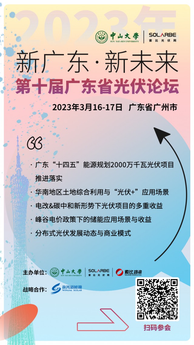 新廣東 新未來!第十屆廣東省光伏論壇 3月16-17日 聚首廣州,為時代籌謀!分布式光伏重心南遷之際與各位同仁一起搶占先機(jī)、贏得主動!趕緊點(diǎn)擊了解詳情報名吧!
