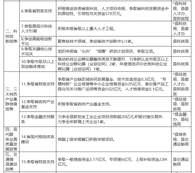 上述8個(gè)領(lǐng)域政策縣財(cái)政2023年預(yù)算安排資金,除交叉重疊部分外,支持總額約50億元。各領(lǐng)域政策縣級(jí)牽頭單位要根據(jù)文件要求,會(huì)同財(cái)政金融、自然資源、能源、人才等要素保障單位,抓緊出臺(tái)配套政策文件,及時(shí)做好政策的宣傳解讀、責(zé)任分解和落地實(shí)施,推動(dòng)政策精準(zhǔn)滴灌、直達(dá)快享,確保基層有感、群眾獲益、企業(yè)得利。