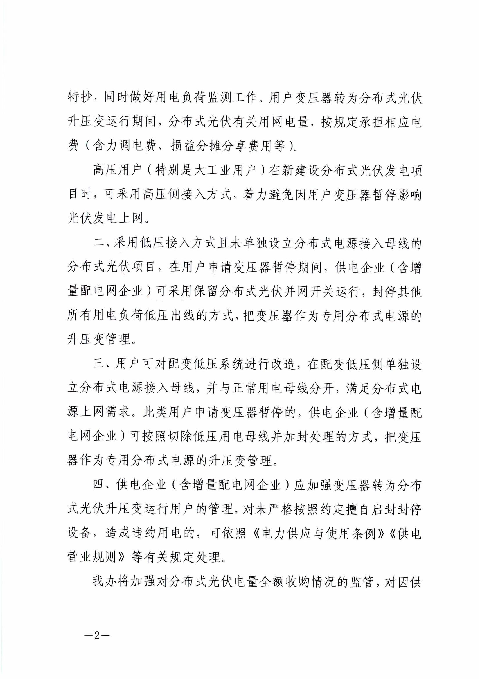 二、采用低壓接入方式且未單獨設立分布式電源接入母線的分布式光伏項目,在用戶申請變壓器暫停期間,供電企業(yè)(含增量配電網企業(yè))可采用保留分布式光伏并網開關運行,封停其他所有用電負荷低壓出線的方式,把變壓器作為專用分布式電源的升壓變管理。