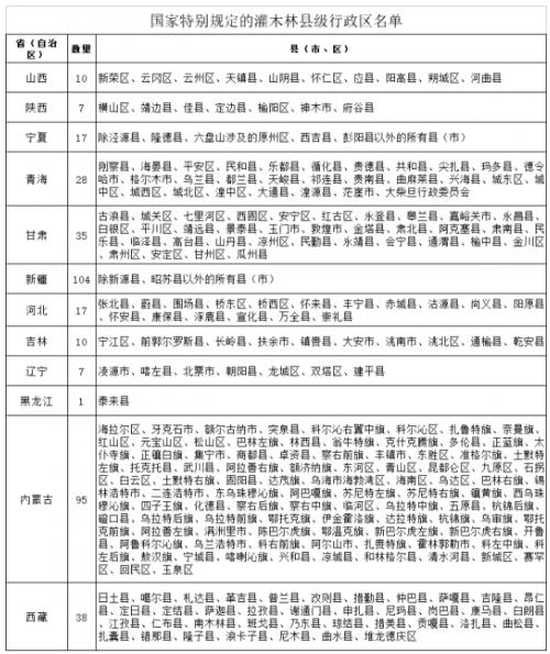 事實上,在今年4月自然資源部、國家林業(yè)和草原局聯(lián)合印發(fā)的《關于以第三次全國國土調查成果為基礎明確林地管理邊界規(guī)范林地管理的通知》中已經明確表示,灌木林標準是指分布在年均降水量400毫米以下的極干旱、干旱、半干旱地區(qū),不包括喬木分布(垂直分布)上限以上地域的灌木林,并給出了涉及的縣級行政區(qū)名單。