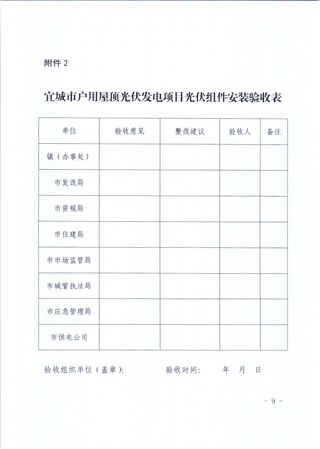 屋頂光伏在組件安裝完成后,業(yè)主需向?qū)俚劓?zhèn)、經(jīng)濟(jì)開(kāi)發(fā)區(qū)提出驗(yàn)收申請(qǐng),然后會(huì)同市發(fā)改局、自然資源和規(guī)劃局、住建局、市場(chǎng)監(jiān)管局、城管執(zhí)法局、應(yīng)急管理局、供電公司等部門(mén)聯(lián)合驗(yàn)收并出具驗(yàn)收意見(jiàn)。